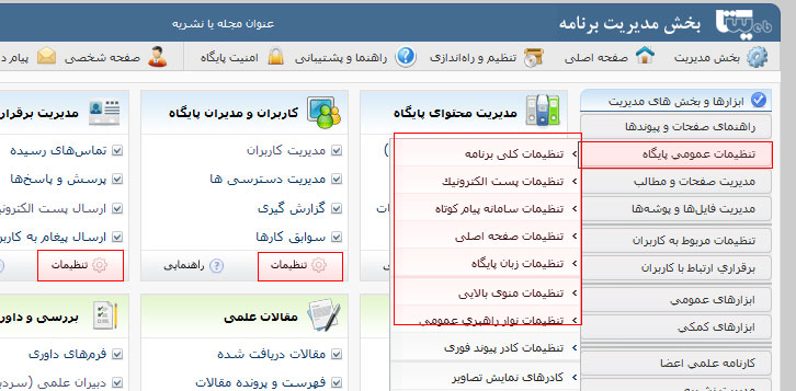 برای استفاده از ماژول مدیریت نشریه، منوهای فرعی مربوط به مقالات (بخش مقالات) و نشریات (مدیریت نشریه) را ببینید و تنظیمات هر بخش را انجام دهید. به ویژه لازم است حتما تنظیمات مربوط به ثبت نام کاربران، تنظیمات مربوط به دریافت مشخصات و فایل مقالات، موضوعات و انواع مقالات و نیز ویژگی های مربوط به شیوه نمایش مقالات منتشر شده (تنظیمات ویژه نشریه) را بررسی و تنظیم نمایید.